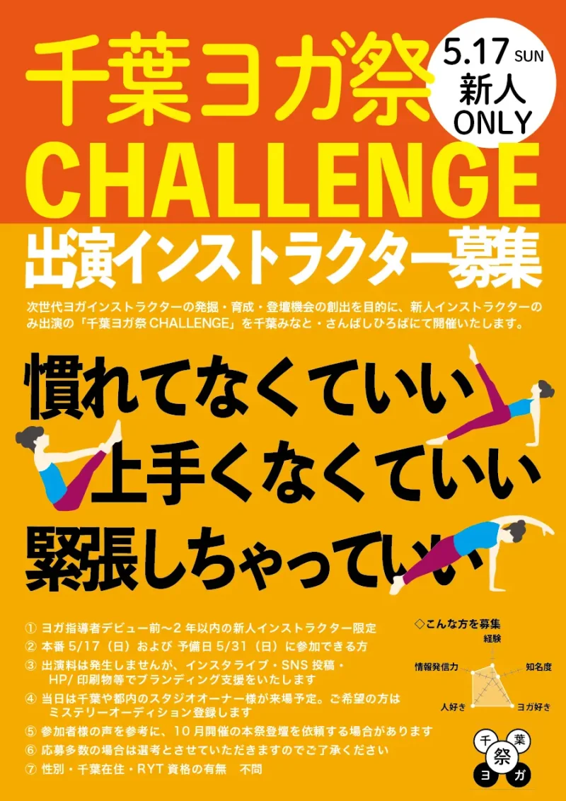 「千葉ヨガ祭 CHALLENGE」は、その発展型として、次世代インストラクターの育成と登壇機会を創出する新人限定のヨガイベントです。